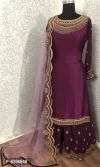 Top :- satin Georgette with havy embrodairy Sleeves :- faux georget Embroidery work Plazo :- faux georget Plazo Type:- Full Stitched Inner :- Santoon Dupatta :- Net with heavy embroidery work Top length:- 46 Plazo length :- 43 Size :- Max up to 48 Plazo size :- max up to 42 Type :- Semi Stitched weight:- 1kg 100% Premium Quality Wash Care : First Wash dry clean Occasion : Festival, Party Wear, Wedding, Festive, Causal, Daily Wear Note: 1. The Shades May Vary Slightly From The Colors Displayed On Your Screen. 2. There Might Be Slight Color Variation Due To Lighting Flash While Photo Shoot. Colors of the actual piece may vary slightly or may not vary at all, from what you see on your monitor. This may be because of monitor resolution.
