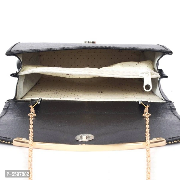Stylish and durable for modern Girls/Women is this Black colored Sling Bag . It is very convenient to carry for casual or party purpose . It is detailed with a shiny touch for an elegant yet casual finish . It features a non-detachable chain to carry it . Its made from premium leatherette material which makes the bag sturdy and durable . Great for carrying your essential stuff with no worries of the bag getting damaged .